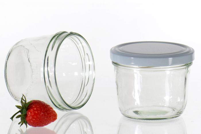 Schraubglas rund.Terrinenform ohne Schulter82er Twist-Off Deckel in weiss, silber oder schwarz.